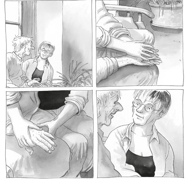 Cette bande dessinée montre d’autres possibles, une approche différente, plus humaine. Celle qui n’assimile pas le malade à sa pathologie, mais qui privilégie l’individu en tant que personne unique, qui souffre mais cherche encore à être respectée et comprise, à qui l’on permet de rester partie prenante du monde, de la société, de la famille. Cette magnifique œuvre parle d’une triade : celui qui souffre, ses proches et l’aidant(e). Chacun, à sa manière, lutte et cherche des solutions face à ce fléau du XXIe siècle. Ainsi, l’épouse d’Étienne s’inscrit dans une dynamique d’être avec, non d’être pour. Elle s’efforce d’être auprès des malades comme une canne, une béquille, une prothèse – mais une prothèse empathique et humaine, qui ne voit pas les vieux comme des séniors infantilisés (dont il faudrait s’occuper comme de robots inconscients), mais comme des êtres qui sont comme nous, simplement perdus dans le chaos mental que provoque la maladie. Chaque geste, chaque parole, chaque acte est pensé pour aider la personne malade à faire par elle‑même, à préserver son autonomie dans les limites du possible, pour alléger la vie des conjoints, des enfants, de la famille – car eux aussi, d’une manière indirecte, souffrent de la même maladie que les aînés.